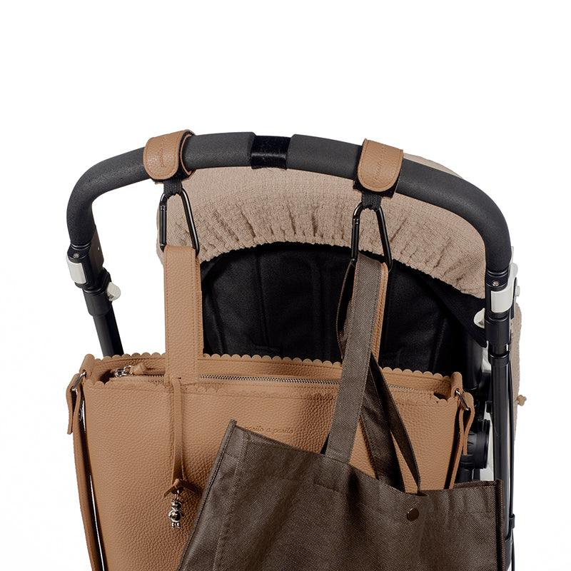 Set di 2 ganci per passeggino Icon Caramel in ecopelle. Gancio in metallo. Molto facile da attaccare grazie alle sue cinghie in velcro. Perfetto per appendere il cestino o qualsiasi borsa tu abbia bisogno di portare sul passeggino. Supporta fino a 5 kg di peso. Universale.